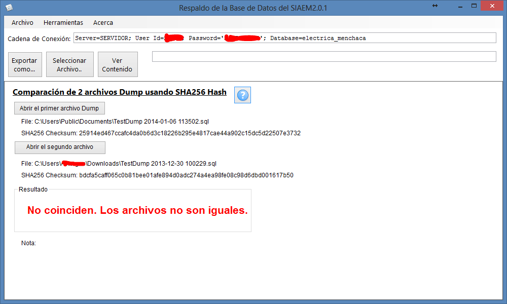 La comparción de Archivos Dump es una opción que ofrece el SIAEM para revisar que los archivos de respaldos se hayan creado de manera correcta. Esto es, debido a que durante el proceso de respaldo puede ocurrir algún error con el motor de la Base de Datos y el archivo no se pueda crear de manera correcta.