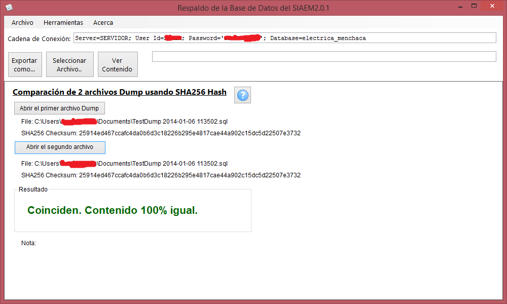 Una vez realizadas las acciones mencionadas anteriormente, se mostrará el resultado de las acciones. Si el contenido de los 2 archivos Dump coinciden, nos mostrará un mensaje indicandonos que los 2 archivos son iguales.