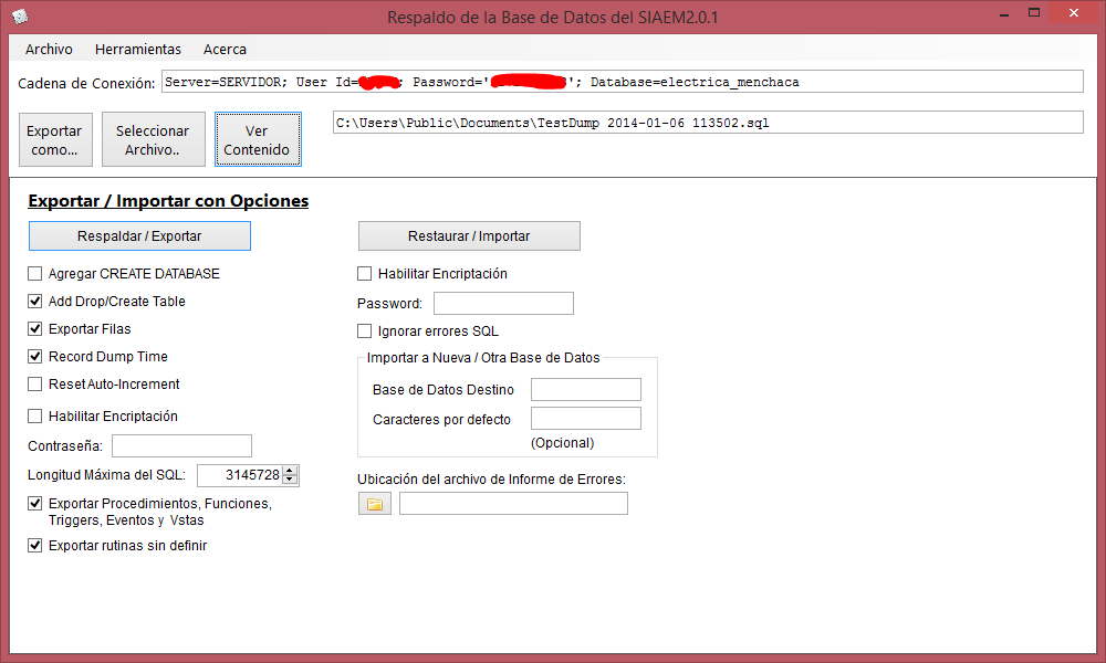 - No aparece nada de información dentro del archivo de respaldo de la base de datos del SIAEM: Verifique que esten seleccionadas las casillas por default del sistema, ya que en caso de no estarlo, se creará un documento en blanco.